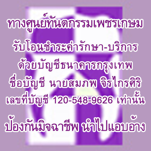 โดนเรายังรักษานโยบายเดิมตั้งแต่เริ่มเปิดศูนย์ทันตกรรมเพชรเกษมสาขา 1 คือคุณหมอทุกคนทำการรักษา คนไข้ด้วยความรักความจริงใจ และด้านวิชาการนั้น ๆ และเราได้ พัฒนาในด้านวัสดุ และ เครื่องมือ ให้ทันสมัยอยู่เสมอ ตลอดจนระบบฆ่าเชื้อโรค ซึ่งเราเน้นเป็นพิเศษ เพื่อให้คนไข้ทุกคนปลอดภัยแบบ 100% สุดท้ายนี้ ทางศูนย์ทันตกรรมเพชรเกษม ได้เปิด website นี้ขึ้นมา เพื่อคามสะดวกในการค้นหา และสามารถสอบถามเรื่องต่าง ๆ ทางทันตกรรมได้ ด้วยความยินดี ขอพระเจ้าอวยพรคนไข้ทุกท่านให้มีสุขภาพกายและสุขภาพเหงือกและฟันที่ดีตลอดไป