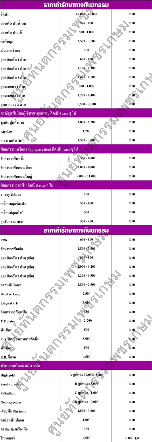 ราคาค่ารักษาดังกล่าว เป็นราคามาตรฐานที่เราใช้ในการประเมิน(เบื้องต้น)ซึ่งแต่ละเคลสการรักษาอาจจะมีภาวะที่จะต้องรักษาต่อเนื่อง หรือ มีค่าใช้จ่ายอุปกรณ์เกี่ยวเนื่อง ทางเจ้าหน้าที่และทันตแพทย์ของเราจะแจ้งให้ทราบ ก่อนการลงมือรักษาทุกครั้ง ยอดค่ารักษาอาจจะไม่เฉพาะตามตัวเลขค่ารักษาด้านล่างทุกเคลส